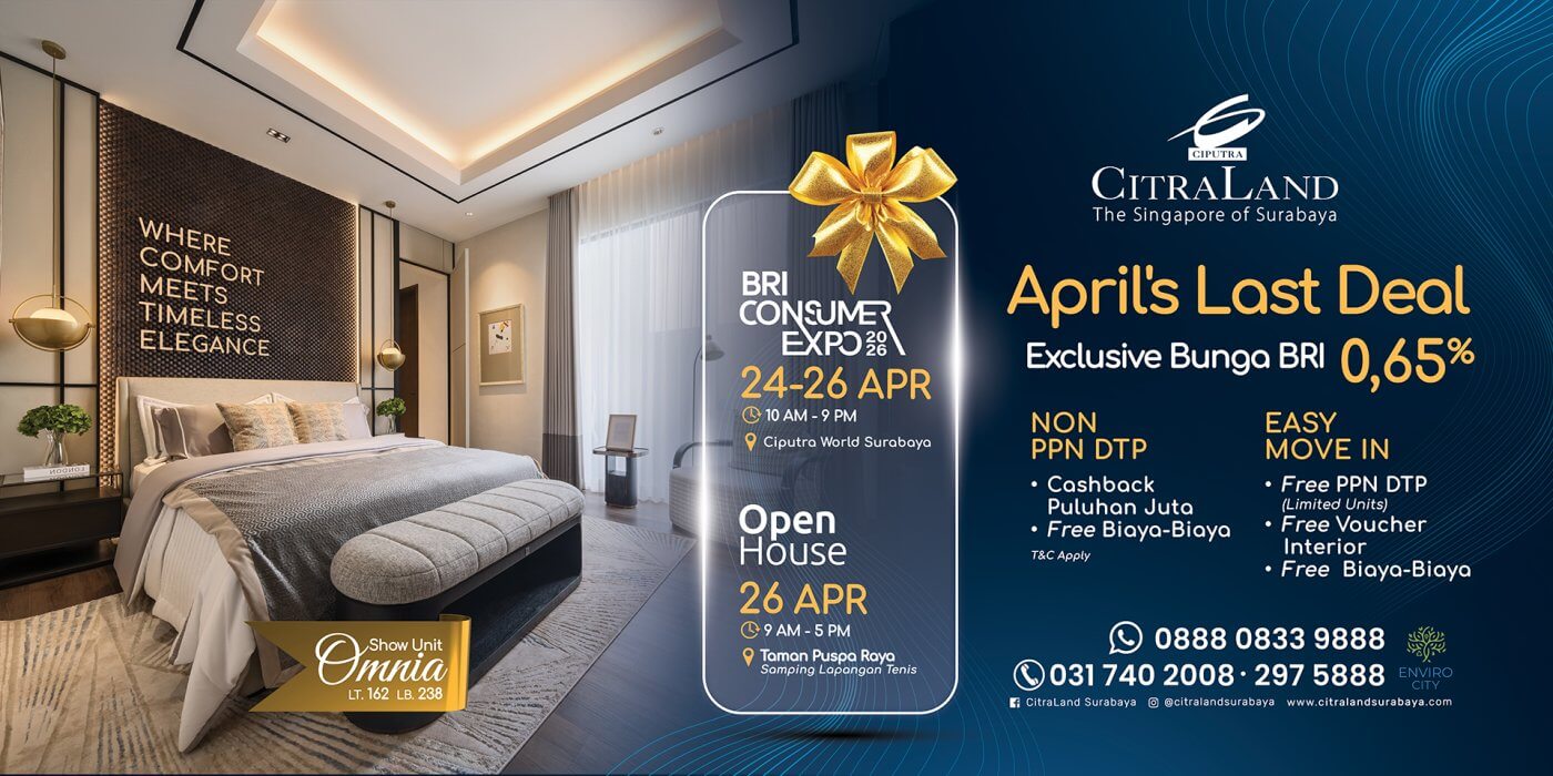 Melalui program April’s Last Deal, Anda bisa memiliki hunian eksklusif di perumahan Citraland Surabaya dengan bunga super ringan mulai dari 0,65%. Tidak hanya itu, berbagai keuntungan tambahan juga siap membuat pembelian rumah jadi lebih hemat dan praktis.