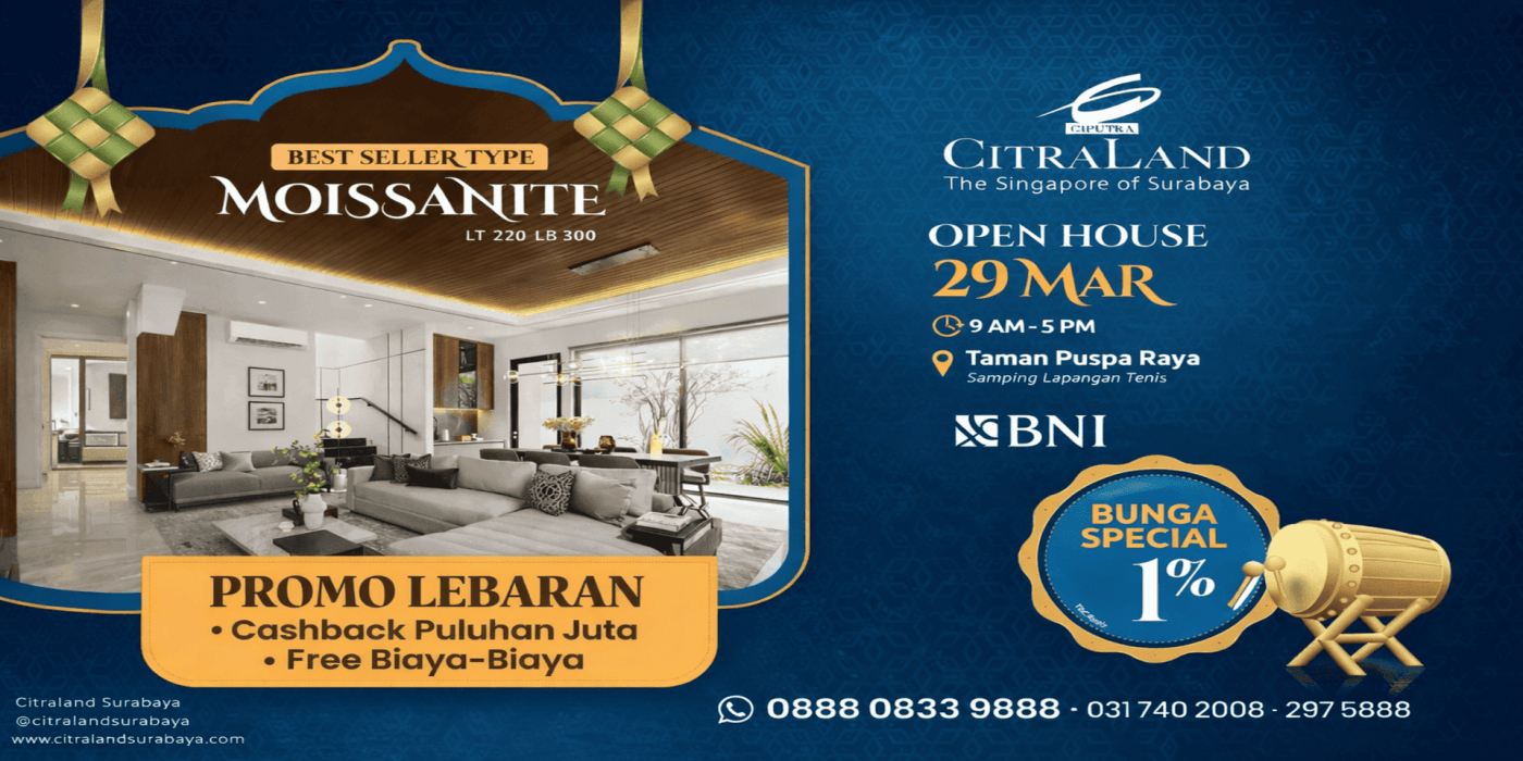 Sebagai salah satu perumahan elit di Surabaya, CitraLand kembali menghadirkan kesempatan menarik bagi Anda yang sedang mencari rumah dijual Surabaya dengan penawaran terbatas melalui program Promo Lebaran.